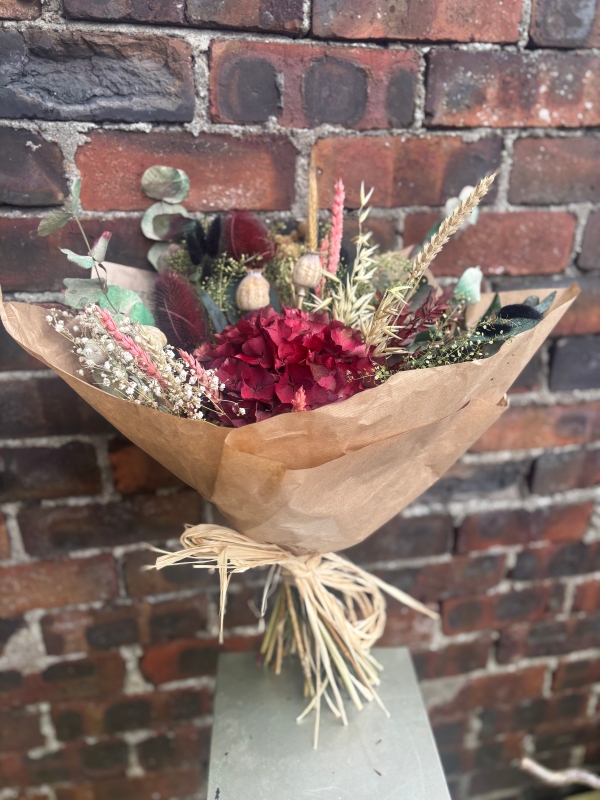 Our hand-tied bouquet features dried grasses, eucalyptus, wheat, hydrangea & poppy heads – carefully preserved and wrapped in rustic kraft paper with a raffia bow.
