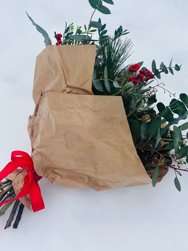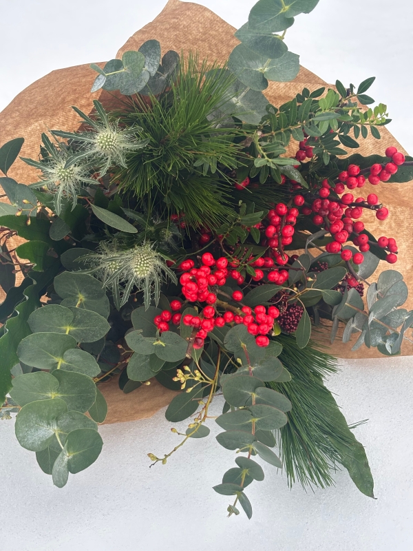 A charming, wintery bouquet featuring vibrant ilex berries, scented seasonal foliage,  cheery red carnation and rustic thistles—a natural, textural arrangement perfect for adding festive warmth.