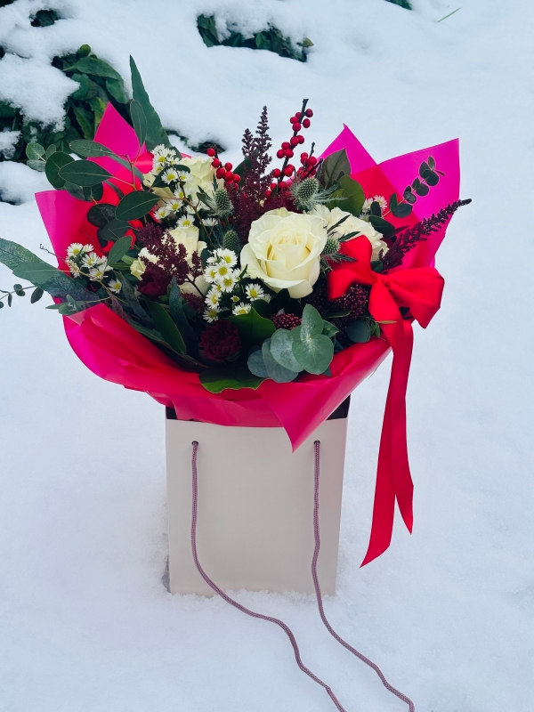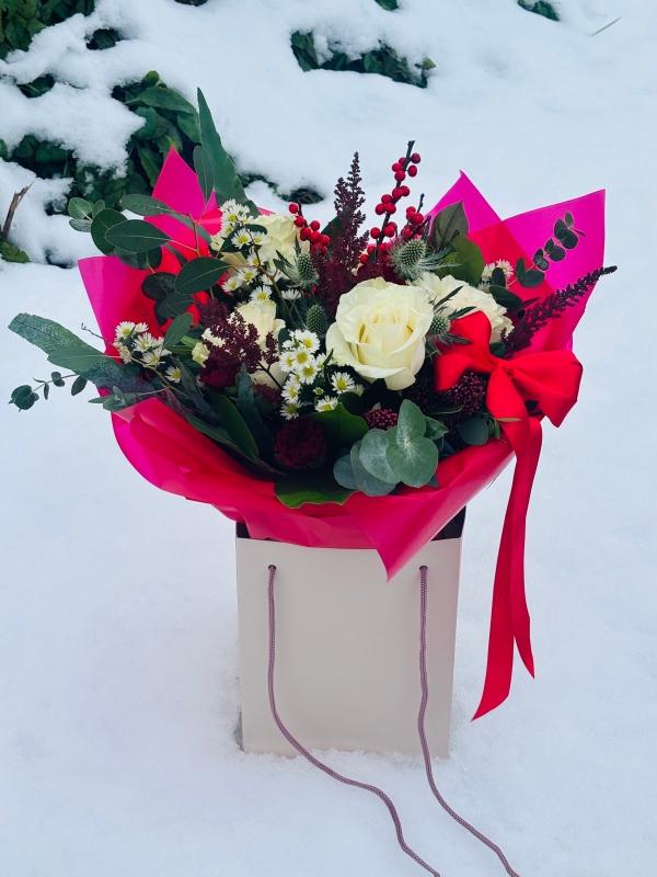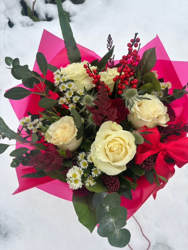 Classic Christmas  is a chic blend of large white roses, rich burgundy astilbe and carnations, soft white aster, vibrant red ilex berries, and striking white eryngium. Elegant, modern, and full of seasonal charm—perfect for any special moment.