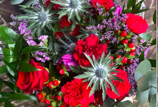 A tall long stemmed hand tied arrangement if natural styled blooms. Red roses, Gerberas, carnations, hypericum, thistles, tulips and limonium.