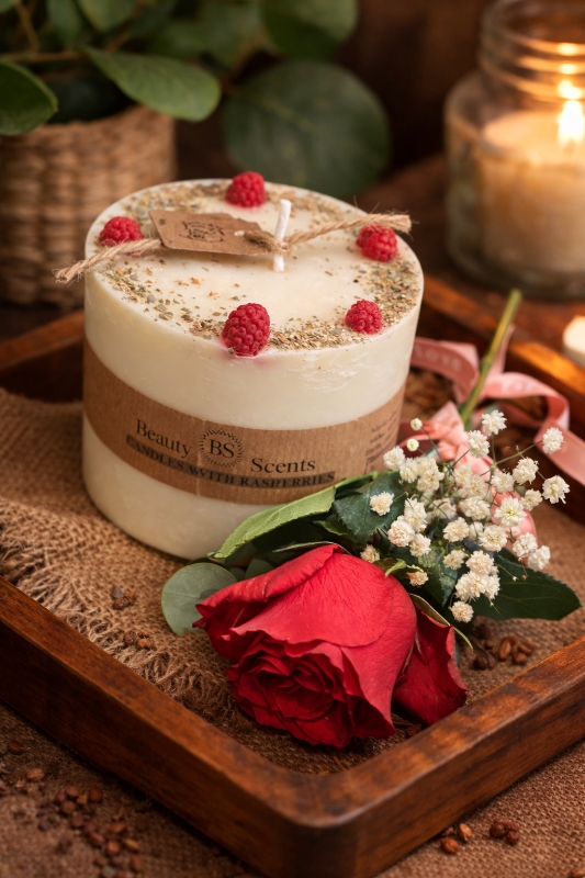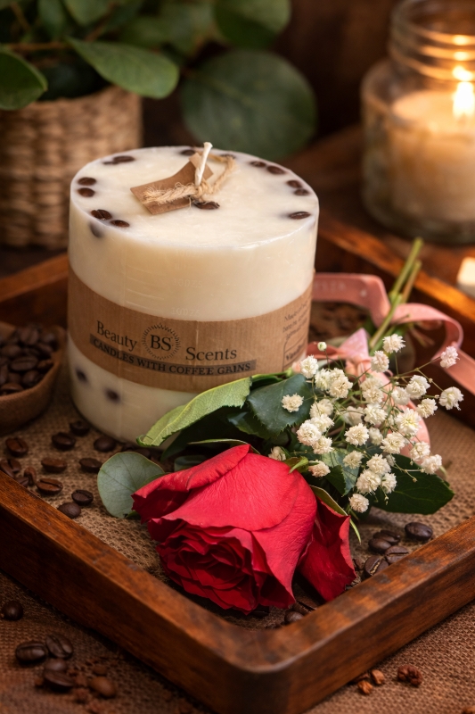 A beautiful single long stemmed red rose with babies breath and eucalyptus, paired with a large scented candle. Create the mood for Valentines day xx