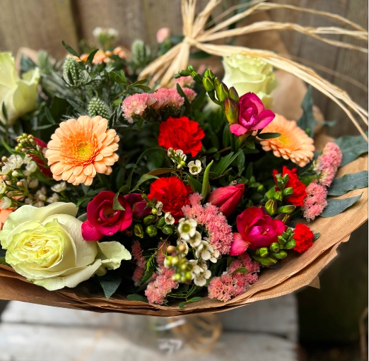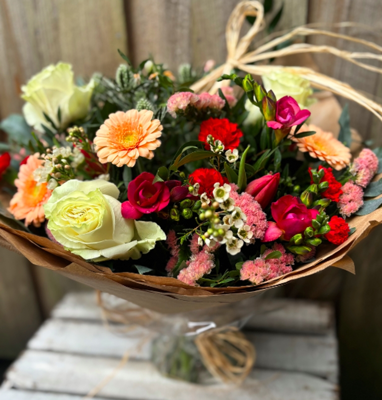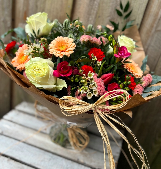 A stunning hand tied bouquet of flowers full of peaches and contrasting reds, gorgeous salmon coloured gerberas with scented freesias and pops of red tulips. Large headed ivory roses and peachy static finish the design with red mini carnations. Mixed with scented foliage, hand tied with kraft paper and presented in a natural gift box
